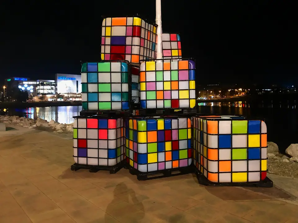The installation features three water containers, styled to mimic a Rubik’s Cube. This colourful design serves as a powerful metaphor for the enormous water consumption and pollution tied to garment dyeing, challenging viewers to reconsider the environmental toll of their fashion choices.
